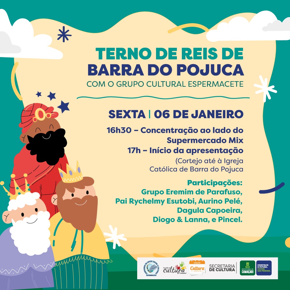 Marcando a abertura do ciclo de festejos populares de 2023 em Camaçari, na próxima sexta-feira (6/1), acontece a tradicional celebração ao dia de Terno de Reis da localidade de Barra do Pojuca, costa do município, promovida pelo Grupo Cultural Espermacete. Animada pelo samba de roda, a manifestação popular comemora a visita e entrega dos presentes pelos Três Reis Magos ao Menino Jesus.