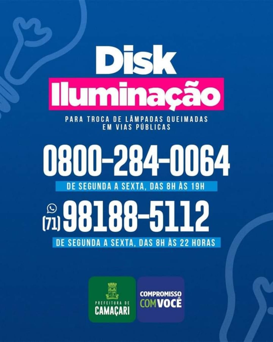 Para solicitar troca de lâmpadas queimadas nas vias públicas, basta que o munícipe entre em contato com a Coordenadoria de Iluminação Pública (CIP) da Sesp, através dos números 0800 284 0064, que funciona de segunda a sexta-feira, das 8h às 19h; ou via WhatsApp (71) 98188-5112, cujo atendimento acontece nos mesmos dias, mas tem horário estendido até às 22h, e acontece, exclusivamente, por mensagem de texto.
