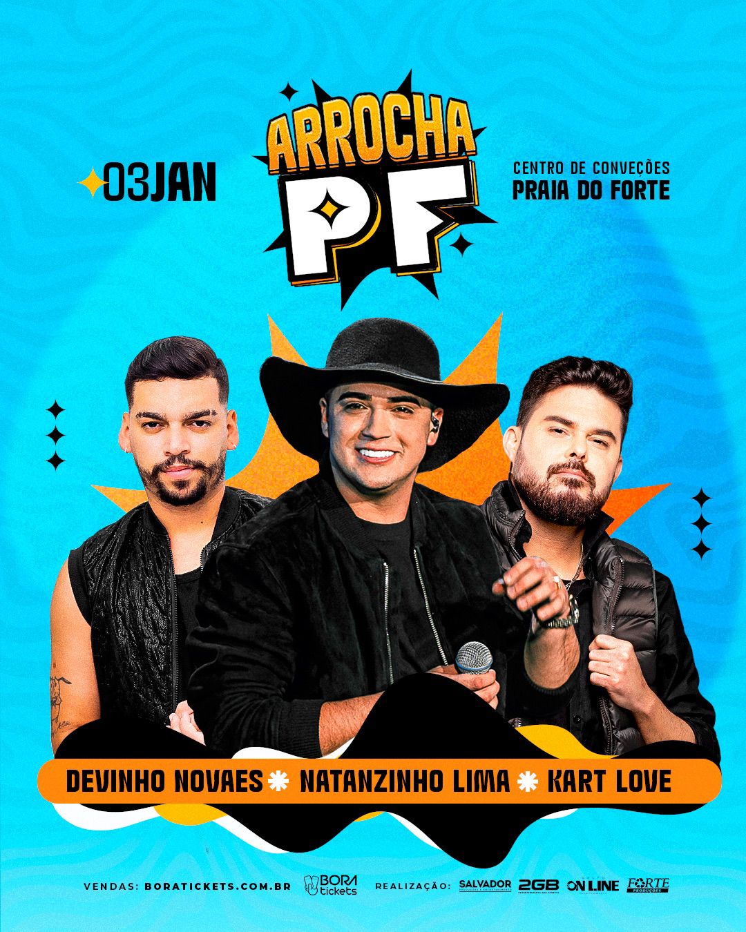 O evento vai reunir Nattanzinho Lima, Kart Love e Devinho Novaes – 3 fortes nomes do cenário, em uma vibe que promete animar o público presente. Em um cenário de muita música, alto astral e animação, o 'Arrocha PF' vai acontecer no Centro de Convenções de Praia do Forte.