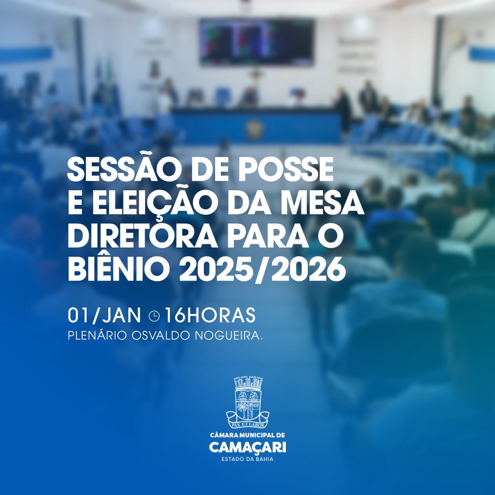 Acontece na quarta-feira (01/01), a partir das 16h, na Câmara Municipal, a Sessão de Posse dos 23 vereadores eleitos em Camaçari para o período 2025-2028. Na mesma ocasião, também ocorrerá a votação para escolha dos parlamentares que irão compor a nova Mesa Diretora para o biênio 2025/2026.