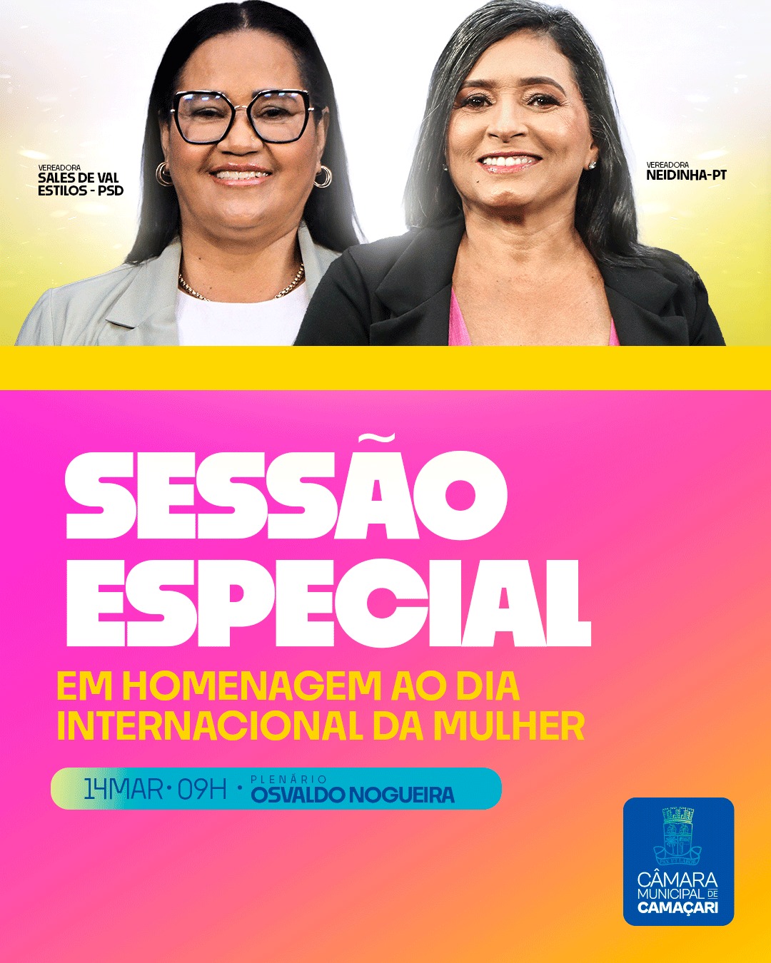 A Câmara Municipal de Camaçari realizará, na sexta-feira (14/03), a partir das 9h, Sessão Especial em homenagem ao Dia Internacional da Mulher, comemorado no dia 08 de março. A atividade foi proposta pelas vereadoras Neidinha (PT) e Sales de Val Estilos (PSD).
