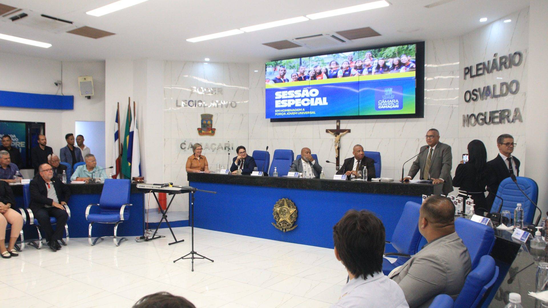 Aconteceu, na tarde desta quinta-feira (27/03), na Câmara Municipal de Camaçari A Sessão Especial em homenagem à Força Jovem Universal (FJU), organização social criada em 1977 e ligada à Igreja Universal do Reino de Deus (IURD). A sessão foi solicitada e presidida pelo vereador Luisão (Republicanos).