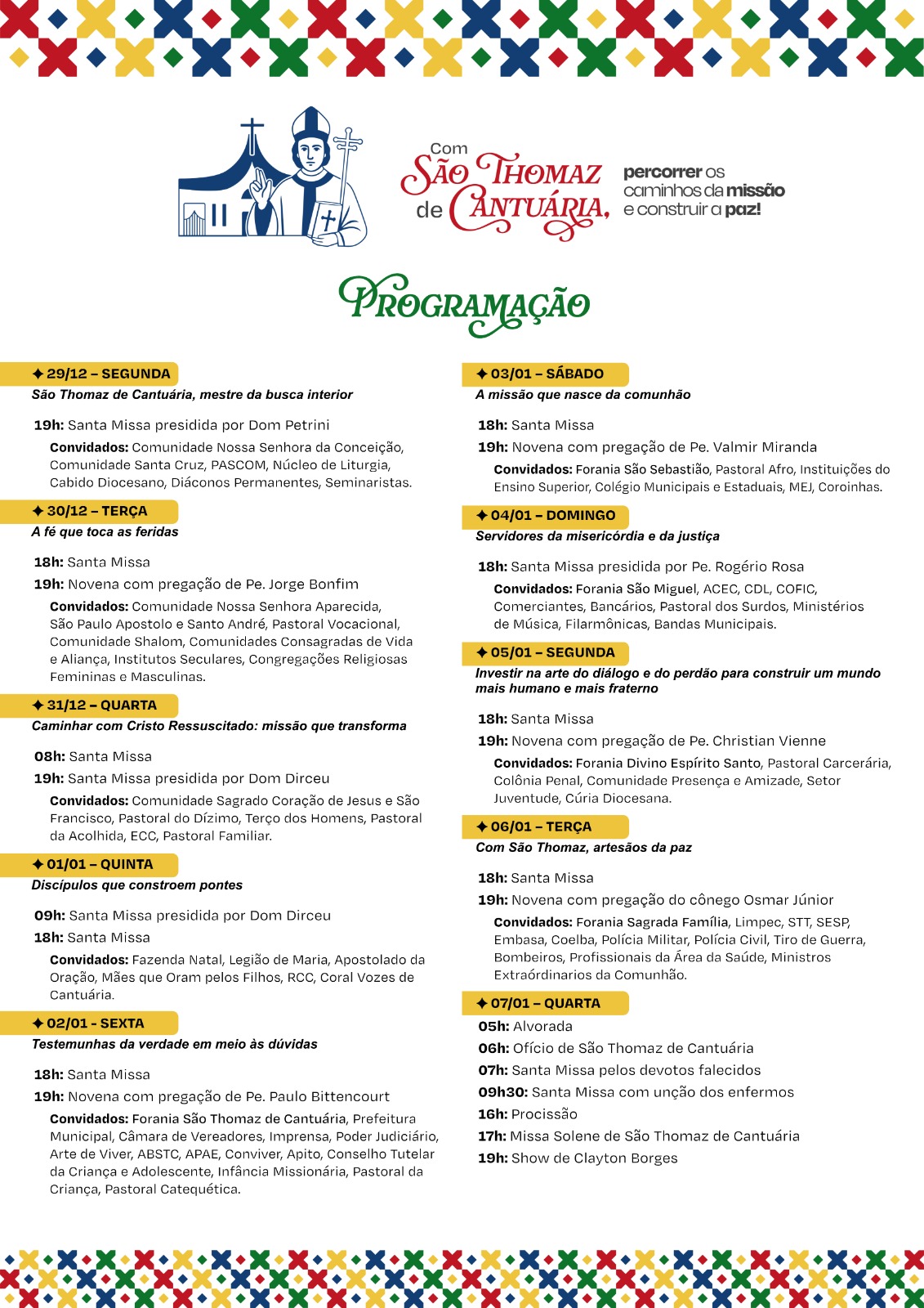 A abertura solene acontece no dia 29 de dezembro, data litúrgica dedicada ao padroeiro, com Missa às 19h, presidida pelo bispo emérito, Dom João Carlos Petrini. O novenário segue até o dia 6 de janeiro, sempre às 19h, com exceção do dia 1º de janeiro e do domingo, 4 de janeiro, quando as celebrações ocorrerão às 18h.