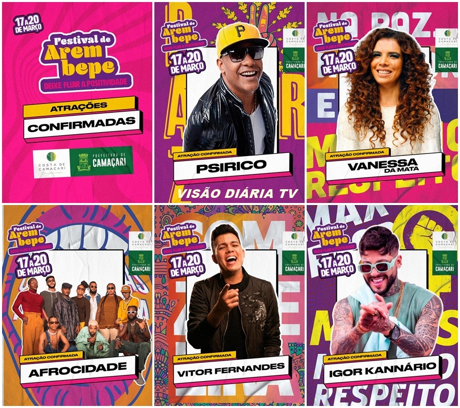 Após dois anos de pausa por conta da pandemia da Covid-19, o Festival de Arembepe 2023 está de volta a todo vapor. Com o tema "Deixe Fluir a Positividade, o evento mais esperado da costa de Camaçari acontece de 17 a 20 de março e contará com cortejo religioso, desfile de 26 blocos, três palcos e ainda a tenda eletrônica. Moradores, visitantes e turistas contarão com apresentações de mais de 50 artistas locais, regionais e nacionais nos dias de festa.