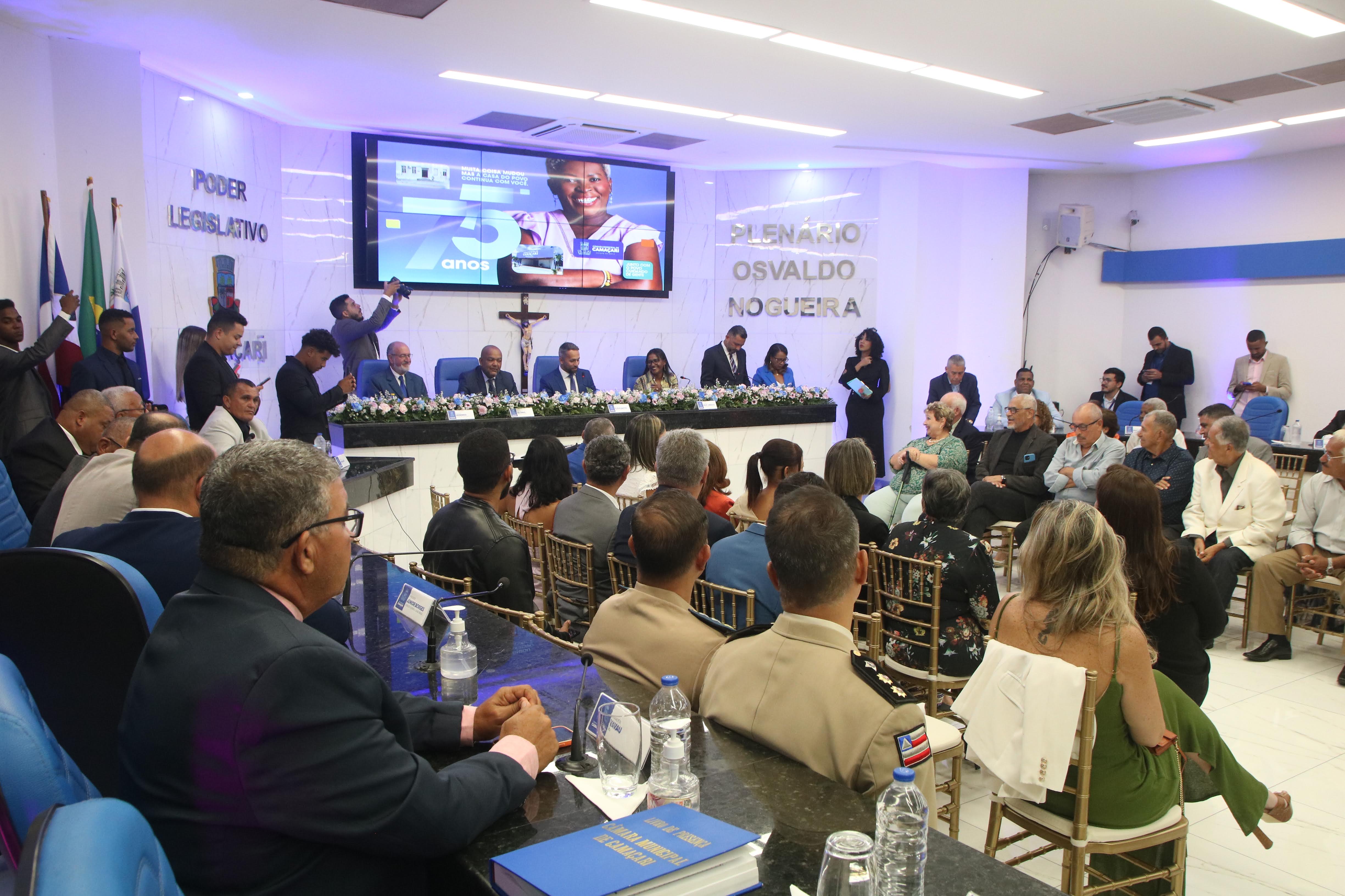 Os 75 anos de fundação da Câmara Municipal de Camaçari foram comemorados com uma Sessão Especial, marcada por homenagens, momentos de emoção, poesia, música e depoimentos saudosos de histórias que contribuíram para as mais de sete décadas de existência da Casa Legislativa. O plenário ficou lotado de populares, autoridades políticas, policiais, secretários municipais, representantes de entidades e profissionais da imprensa local.