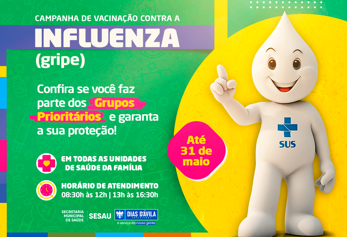 A Prefeitura Municipal de Dias d'Ávila, através da Secretaria de Saúde (SESAU), já deu início a Campanha de Vacinação contra a Influenza em nosso município. A ação segue até 31 de maio, com o objetivo de vacinar os grupos prioritários contra a gripe. Essa campanha é realizada anualmente pelo Mistério da Saúde, e busca proteger a população contra os vírus da influenza, que podem causar doenças respiratórias graves, principalmente em grupos mais vulneráveis.