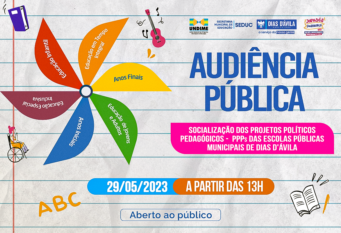 A Prefeitura de Dias d'Ávila, através da Secretaria de Educação (SEDUC), convida a comunidade a participar da Audiência Pública de Socialização dos Projetos Políticos Pedagógicos (PPPs) das Escolas Públicas Municipais. A atividade será realizada na próxima segunda-feira (29), a partir das 13h, na Escola Municipal Altair da Costa Lima.
