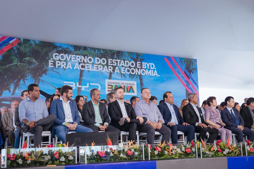Comemorando a chegada de investimentos, emprego e renda para Camaçari, o prefeito Elinaldo Araújo participou da cerimônia de anúncio da implantação da BYD – "Build Your Dreams" no município, realizada nesta terça-feira (4/7), no Farol da Barra, em Salvador. Esta é a primeira fábrica de carros elétricos da empresa nas Américas, que deve contar com um investimento de R$ 3 bilhões e gerar mais de 5 mil empregos.