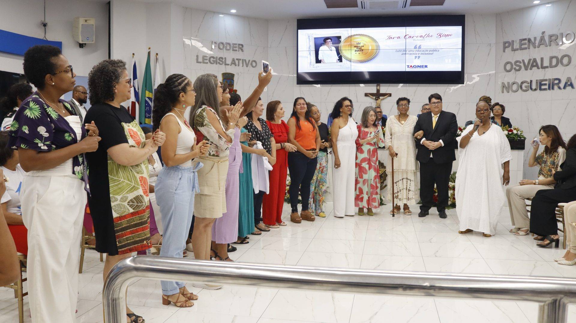 A primeira honraria entregue foi a Comanda Maria Quitéria para a professora Iara Carvalho Bispo, homenageada pelo vereador Tagner Cerqueira, pela gestão do Centro Educacional Maria Quitéria, em busca de uma educação antirracista. "Eu sou pequena, o quilombo do Maria Quitéria é que me fortalece, porque esse quilombo que está aqui, que são meus professores, os funcionários que trabalham lá na escola, eles me protegem abaixo de Deus e dos Orixás. Quero agradecer a minha família biológica, a essa família 'quiteriana', ao meu grupo gestor e ao vereador Tagner, que apesar de ser um homem branco, está tendo uma atitude antirracista", ressaltou a educadora bastante emocionada.