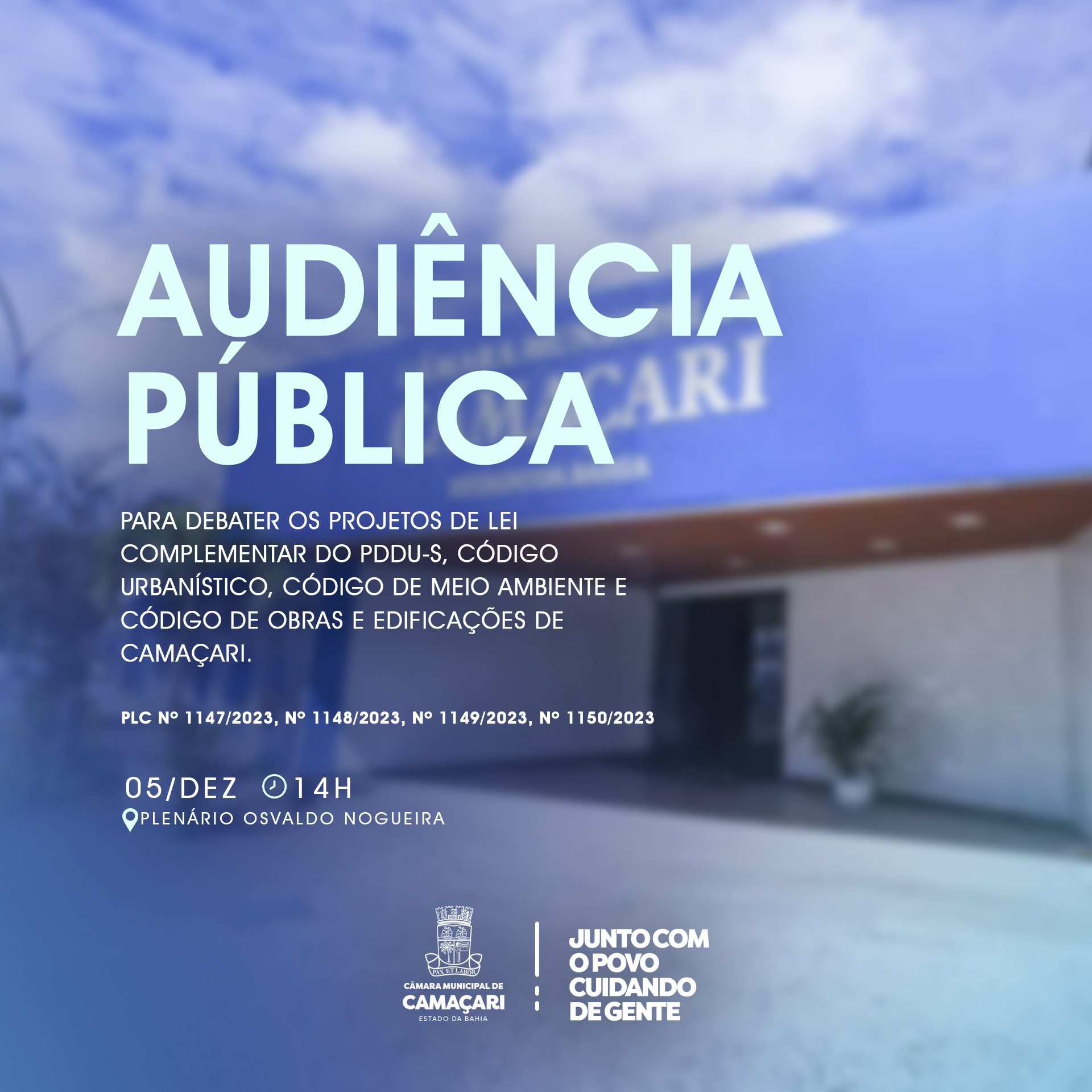 A Câmara de Camaçari realizará, na terça-feira (05/12), Audiência Pública sobre o Plano Diretor de Desenvolvimento Urbano Sustentável (PDDU-S) – (PLC No 1147/2023), e sobre o PLC No 1148 (Código Urbanístico), PLC No 1149/2023 (Código de Meio Ambiente) e PLC No 1150/2023 (Código de Obras e Edificações). A atividade acontecerá às 14h, no plenário da Câmara Municipal.