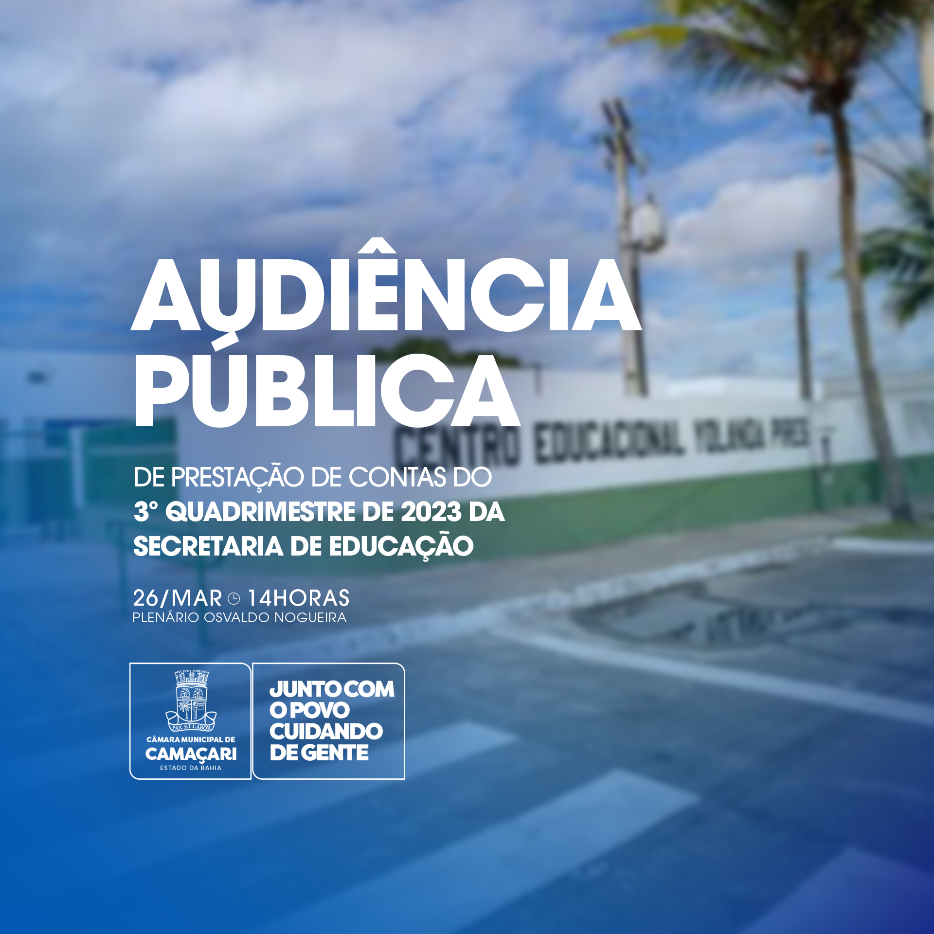 Acontece na terça-feira (26/03), a partir das 14h, no plenário da Câmara de Camaçari, Audiência Pública para prestação de contas da Secretaria Municipal da Educação (Seduc), referente ao 3º quadrimestre de 2023.