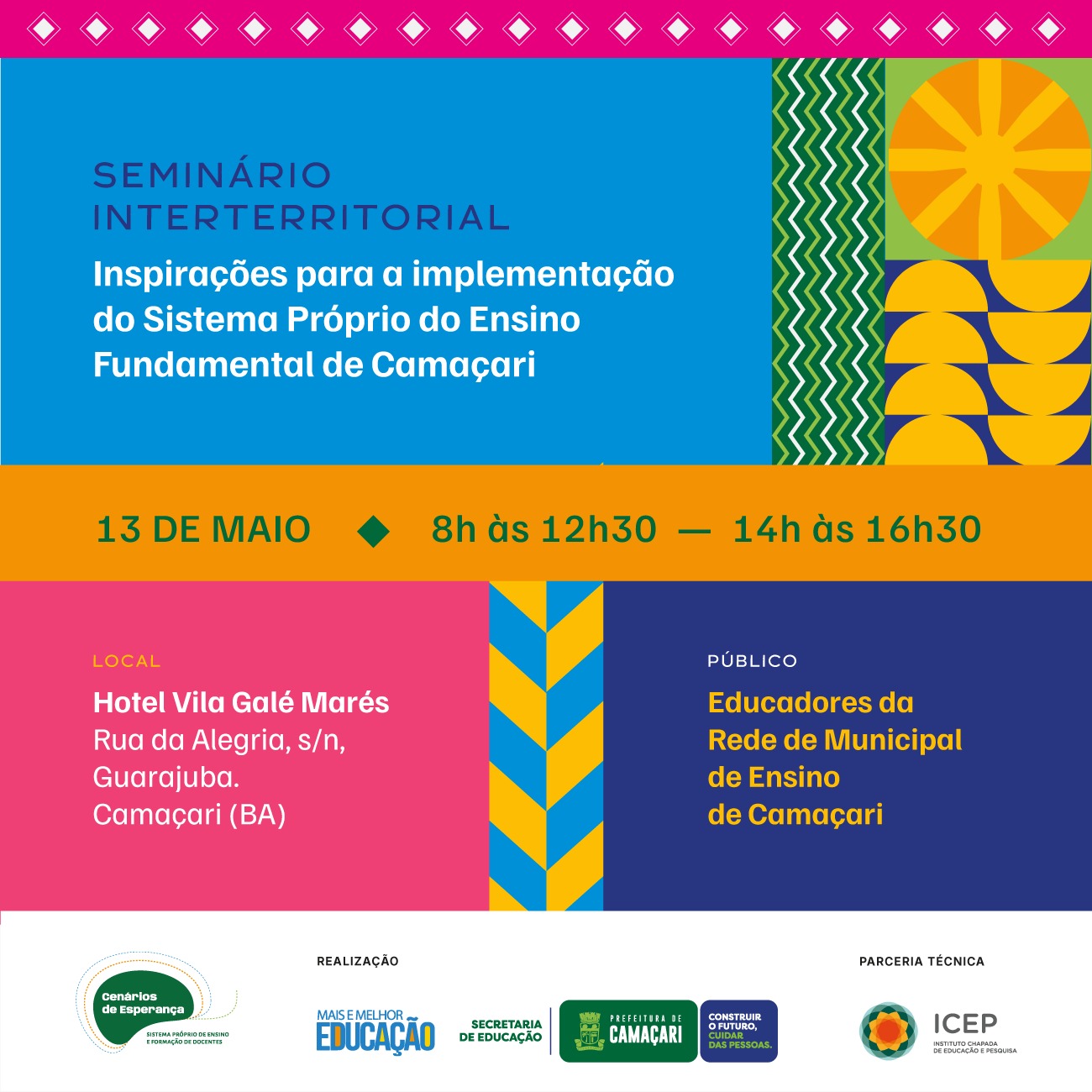 Com a temática "O futuro em nossas mãos: inspirações para implementação do sistema próprio do Ensino Fundamental de Camaçari", educadores da rede pública municipal de ensino, e de outras redes parceiras, terão a chance de compartilhar experiências e unir resultados destinados à continuidade de um sistema educacional de referência durante o Seminário Interterritorial, a ser realizado segunda-feira (13/5), das 8h às 12h30 e das 14h às 16h30, no auditório do Hotel Vila Galé Marés, em Guarajuba, orla do município.