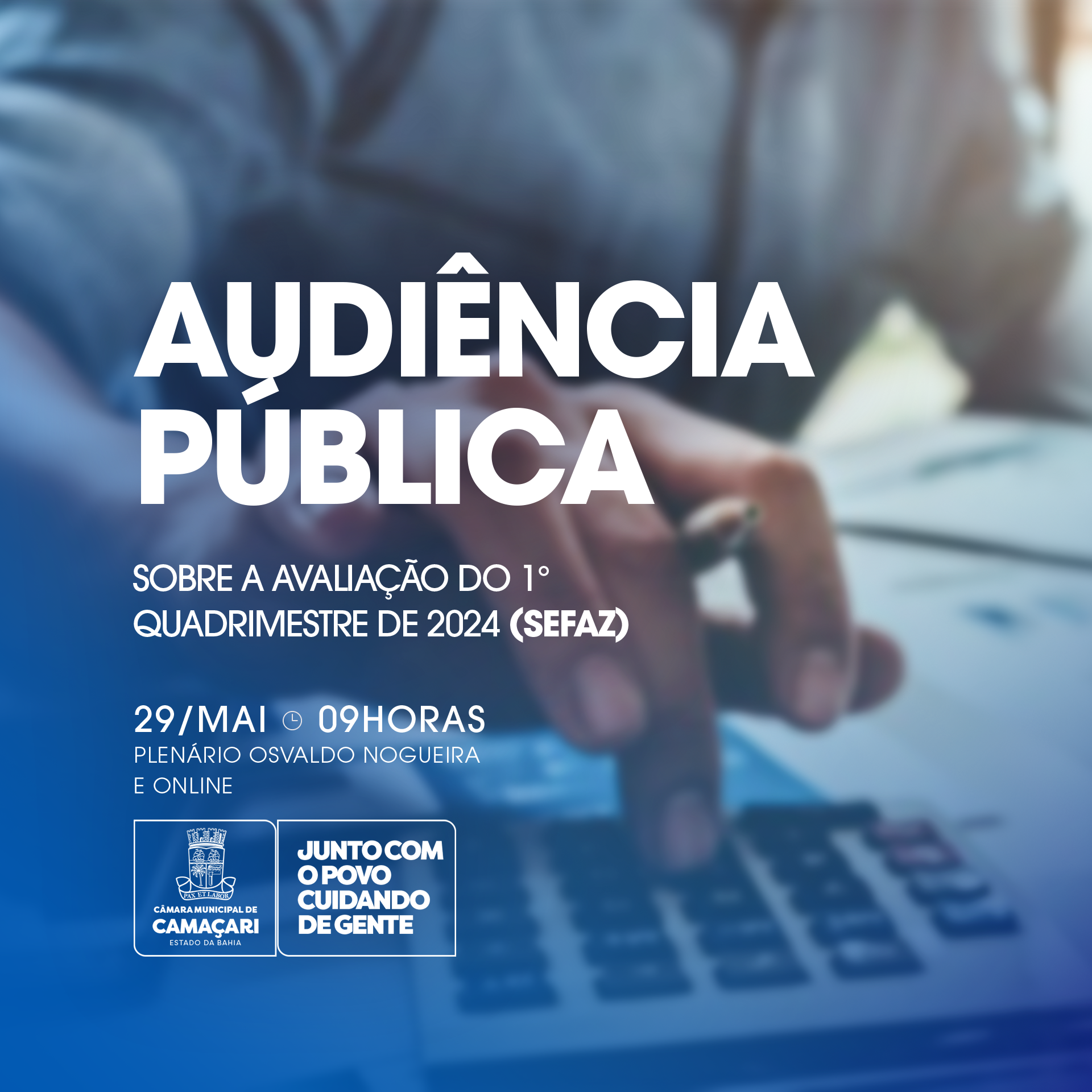 A Câmara de Camaçari sediará, na quarta-feira (29/05), a partir das 9h, a Audiência Pública da Secretaria Municipal da Fazenda para prestação de contas referente ao 1º quadrimestre de 2024. A atividade será realizada virtualmente, através de videoconferência, e os dados serão apresentados por servidores da pasta.