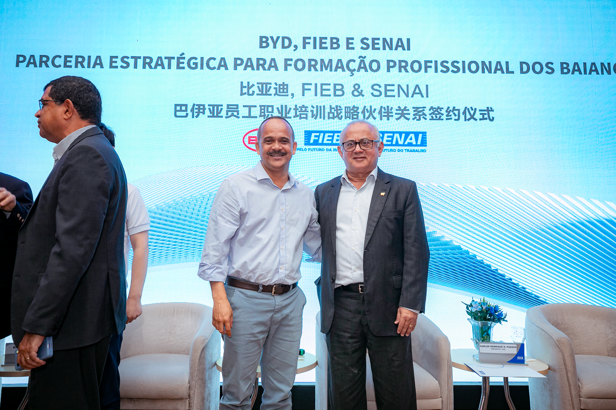 O prefeito Elinaldo Araújo prestigiou, nesta sexta-feira (12/7), a cerimônia de assinatura do protocolo de intenções para cooperação em projetos nas áreas educacional, tecnológica e científica realizado entre o Serviço Nacional de Aprendizagem Industrial (Senai) - Bahia, em parceria com a montadora chinesa de veículos automotores elétricos Build Your Dreams (BYD). O evento aconteceu no auditório da Federação das Indústrias do Estado da Bahia (FIEB), no Stiep, em Salvador.