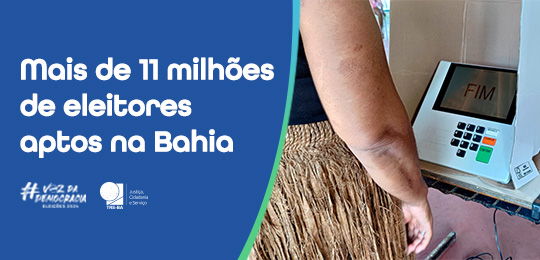 Pra todos verem: Imagem ilustrativa com os dizeres "Mais de 11 milhões de eleitores aptos na Bahia" acompanhada de uma foto onde aparece uma pessoa indígena em frente a urna eletrônica.