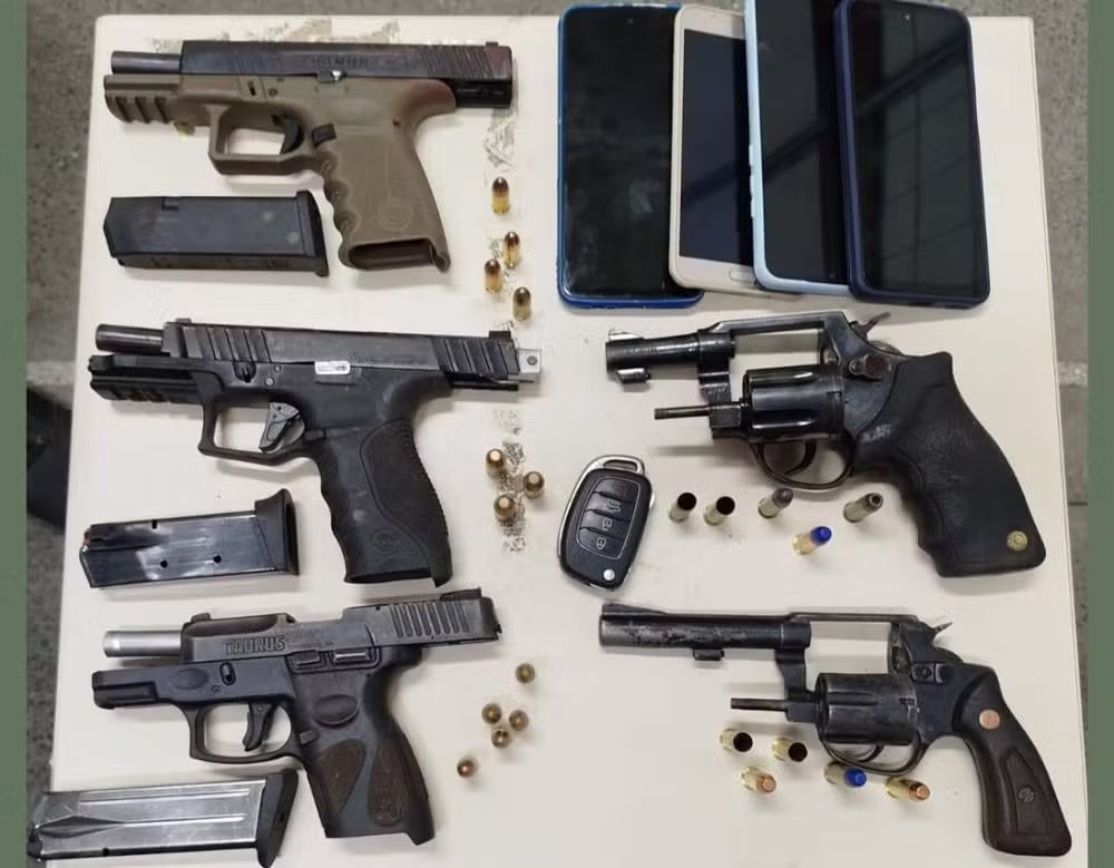 Com os suspeitos, os policiais apreenderam quatro pistolas, um revólver, munições, celulares, uma máquina de passar cartão, uma carteira e R$ 15.