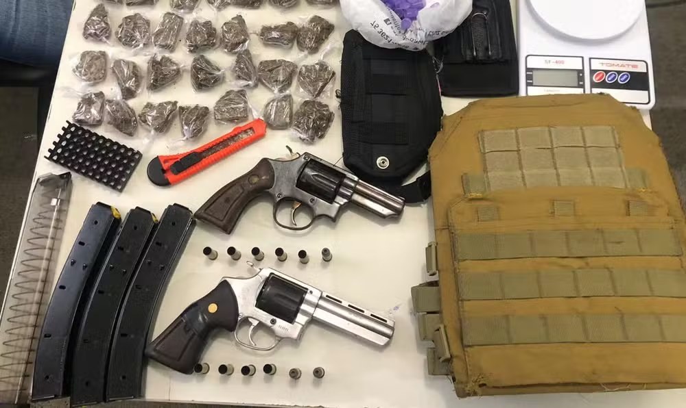 Com a dupla alcançada, foram apreendidos dois revólveres calibre 38, carregadores alongados para pistola (os mesmos que aparecem nos vídeos publicados nas redes sociais), munições, placas de coletes balísticos, drogas, um drone e uma balança.