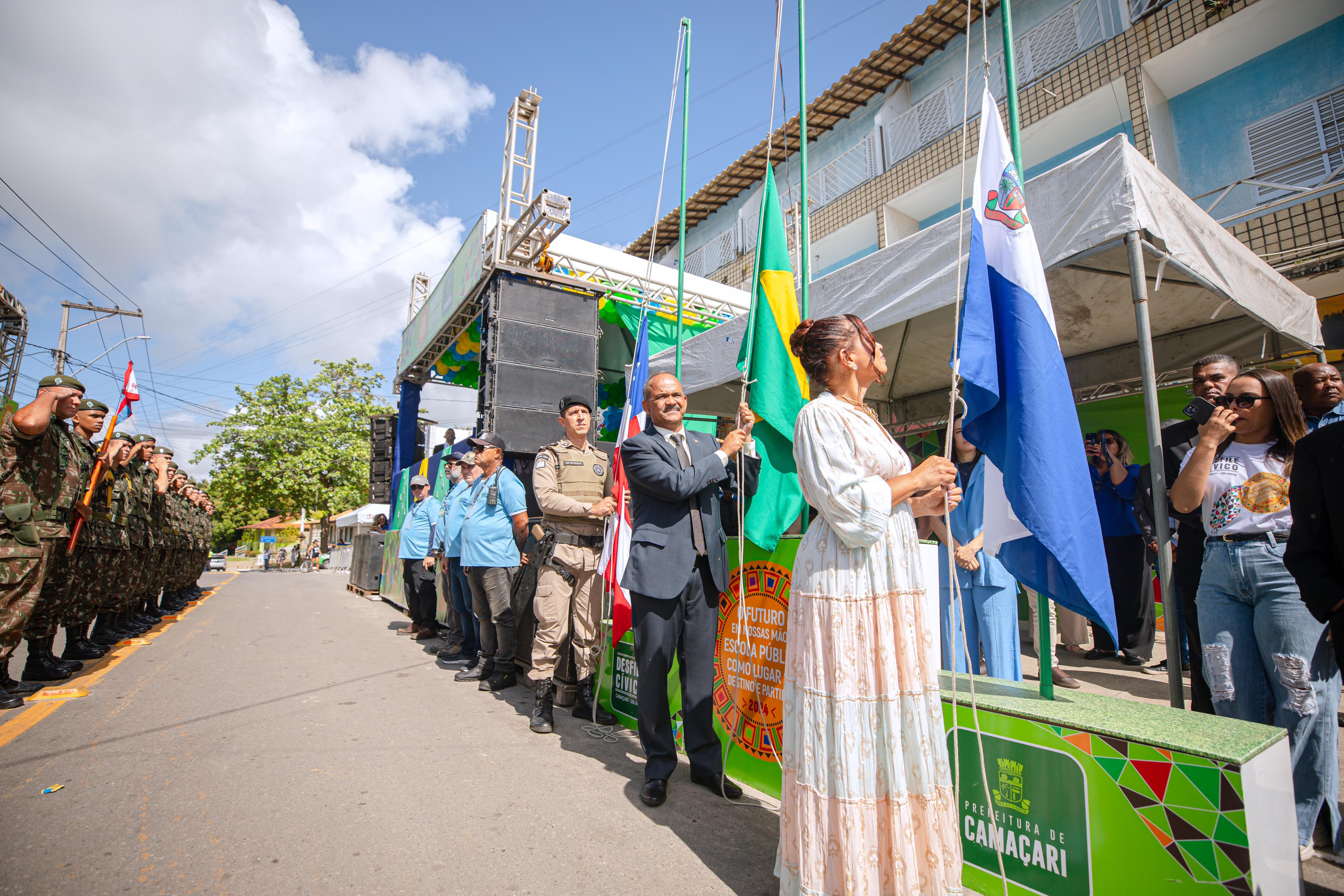 A abertura do ato solene foi marcada pelo hasteamento das bandeiras do Brasil, da Bahia e de Camaçari, abrilhantado pela Sociedade Filarmônica 28 de Setembro, que executou os hinos sob a regência do maestro Joélio Santos.