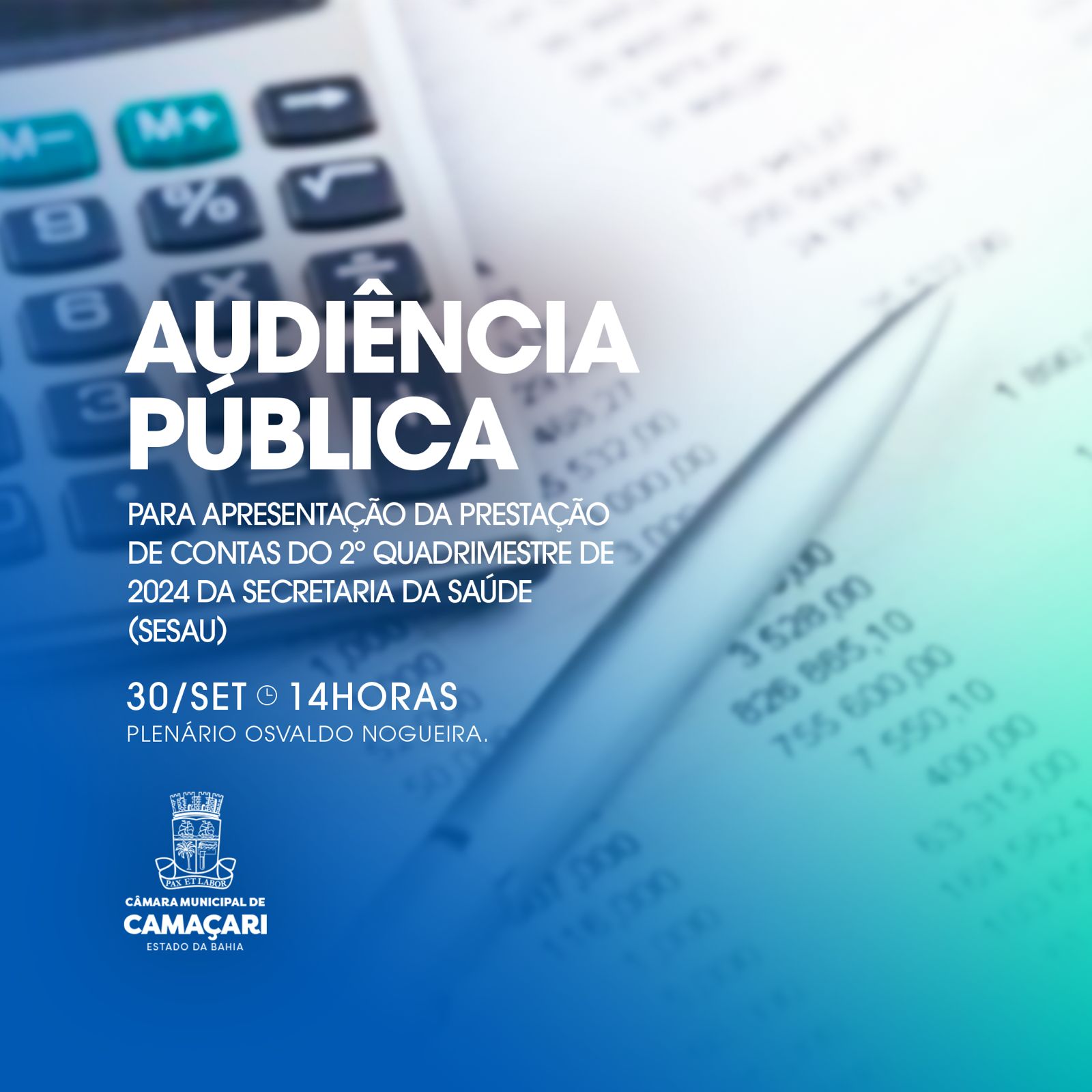 A Comissão de Saúde da Câmara de Camaçari presidirá, na segunda-feira (30/09), Audiência Pública de prestação de contas do 2º quadrimestre de 2024 da Secretaria Municipal da Saúde (Sesau). A atividade acontecerá no Plenário Osvaldo Nogueira, a partir das 14h.