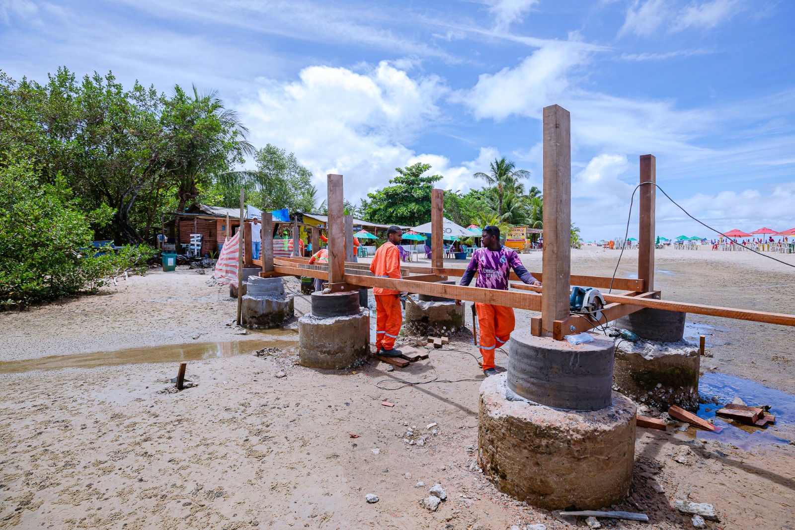 As obras de requalificação e urbanização de Barra do Jacuípe, na costa do município, avançam e, atualmente, as intervenções abrangem tanto a construção da ponte de madeira de lei, sobre o Rio Jacuípe, quanto a execução de um novo sistema de drenagem na Rua Manoel Leal, que, em breve, será pavimentada.