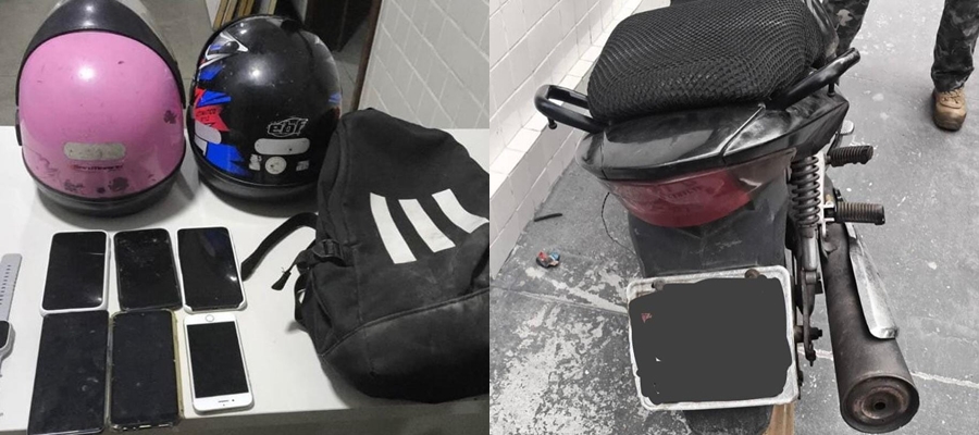 Ao verificar o veículo, constatou-se que a moto, uma Honda CG, possuía restrição de roubo/furto. Além disso, uma mochila preta contendo pertences pessoais, um relógio digital e seis aparelhos celulares de origem duvidosa foi apreendida.