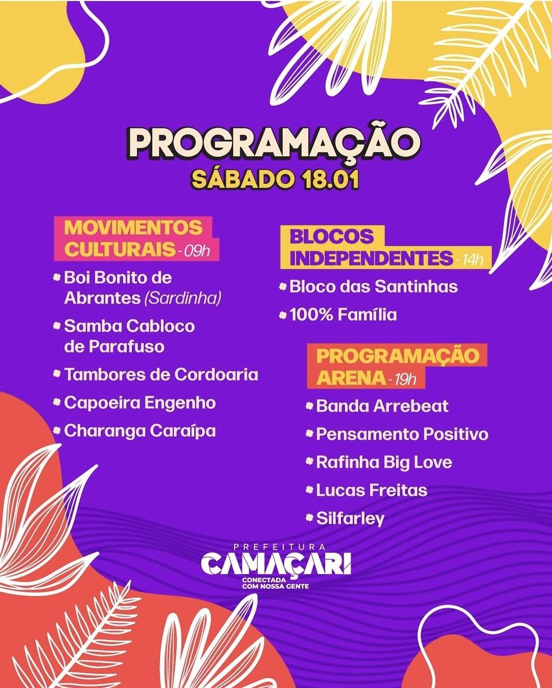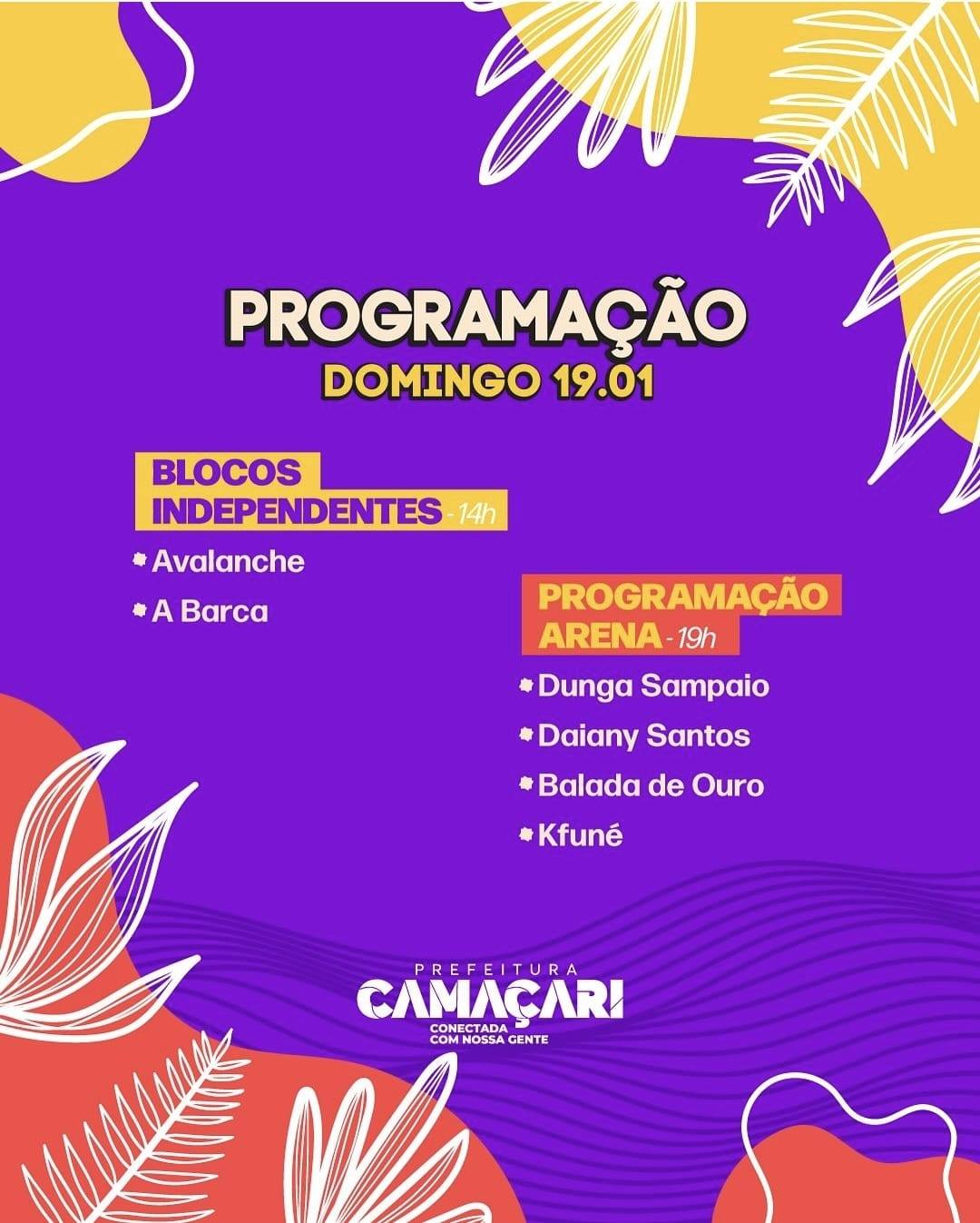 A programação da parte profana da festa será divulgada em breve. A lavagem é promovida pela Prefeitura de Camaçari, por intermédio da Coordenação de Eventos, setor vinculado à Secretaria de Governo (Segov), com apoio de diversas secretarias e órgãos municipais.