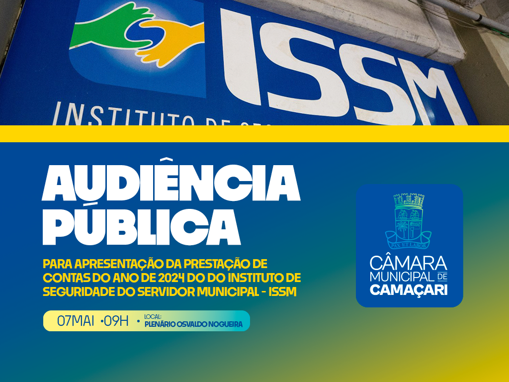 A Câmara de Camaçari sediará, na quarta-feira (07/05), a partir das 9h, Audiência Pública para prestação de contas do ano de 2024 do Instituto de Seguridade do Servidor Municipal (ISSM).