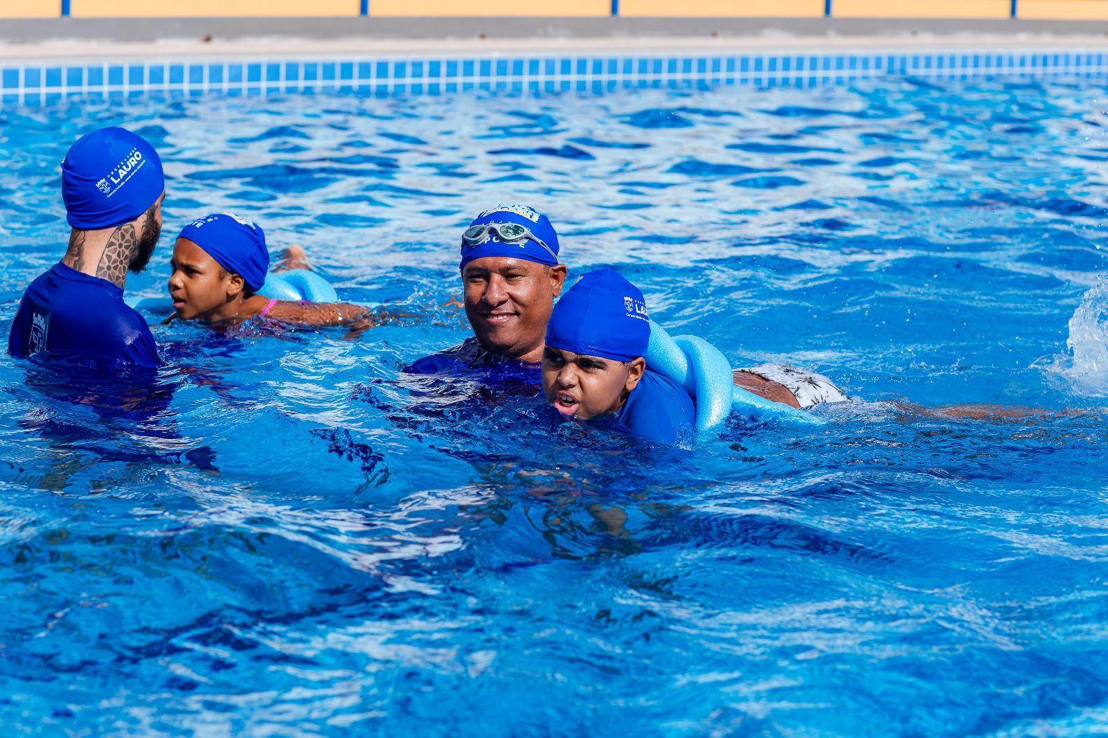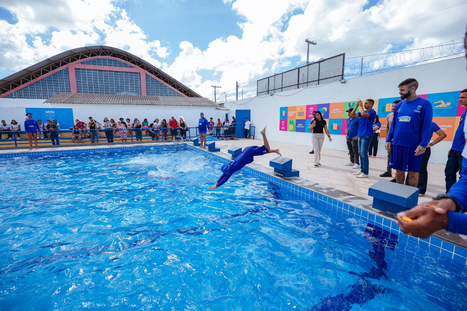 A Prefeitura de Lauro de Freitas, por meio das secretarias municipais de Cultura, Lazer, Juventude e Esporte (SECUJE) e de Educação (SEMED), deu início, na manhã desta quarta-feira (20/8), às aulas de natação na nova Arena Aquática, localizada em Itinga. A atividade integra o Programa Esporte Cidadão. 2 e contou com a presença da prefeita Débora Regis durante a aula inaugural.