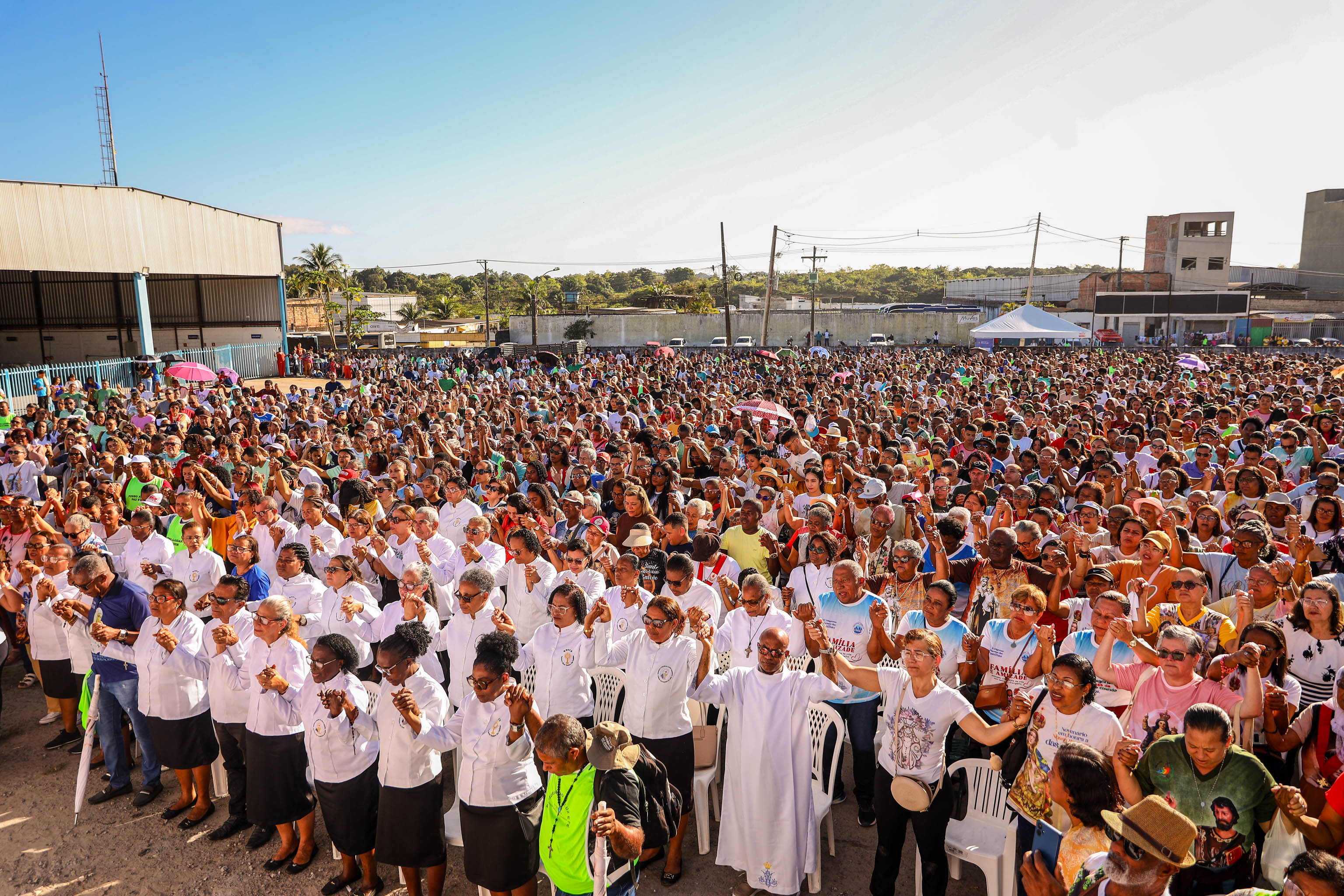Como de costume, antes de encarar os quase 6 quilômetros de caminhada, os fiéis participaram da Missa presidida pelo bispo da Diocese, dom Dirceu de Oliveira Medeiros. O rito dominical aconteceu ainda no local de concentração, na base veicular, próximo ao posto desativado da Polícia Rodoviária Estadual (PRE), às margens da BA 522.