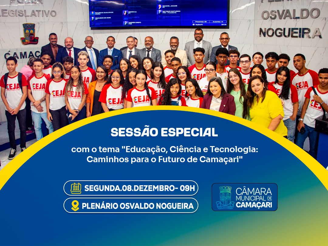 A Câmara de Camaçari realizará, na segunda-feira (08/12), às 9h, a Sessão Especial com o tema "Educação, Ciência e Tecnologia: Caminhos para o Futuro de Camaçari". A atividade foi solicitada pela vereadora Neidinha (PT).