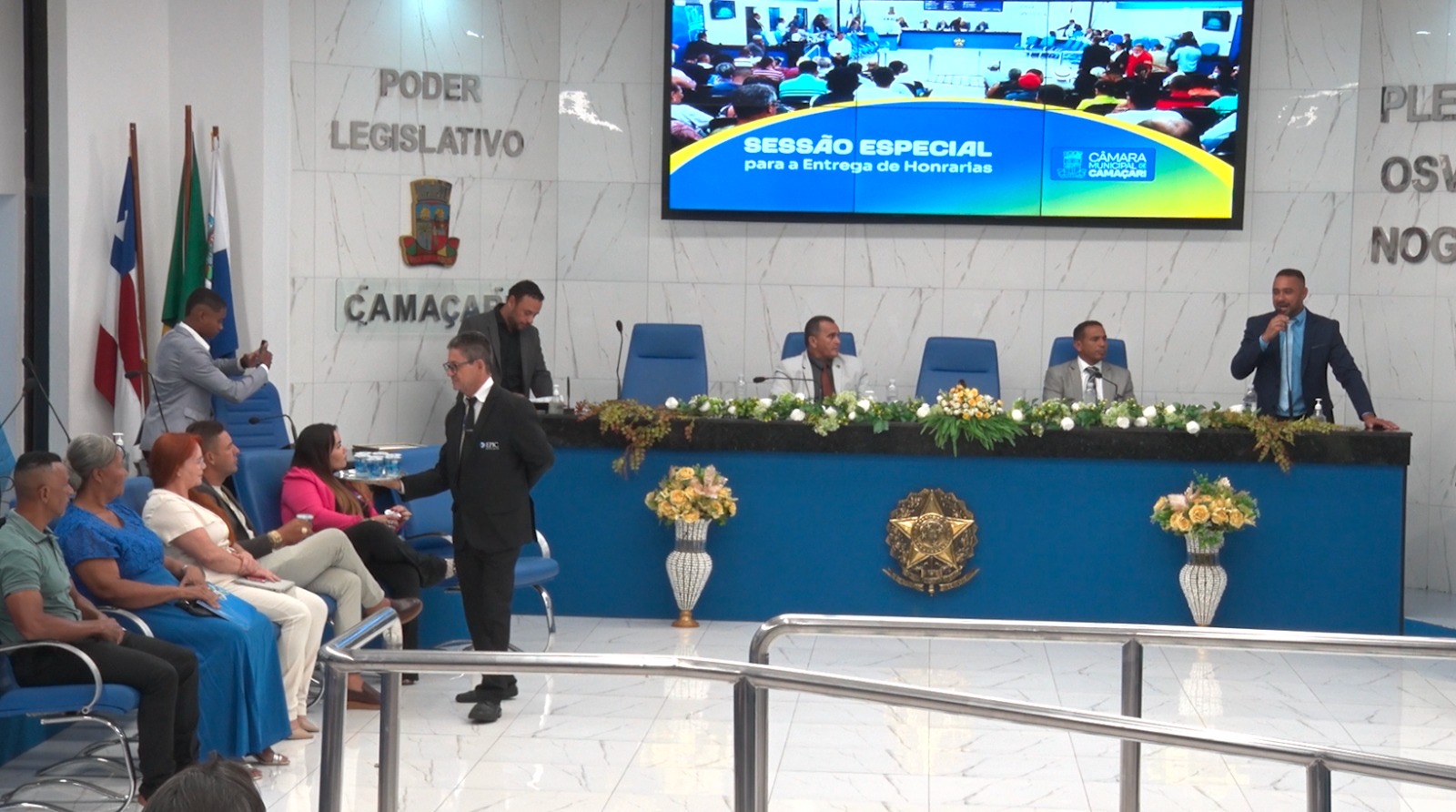 A Câmara Municipal de Camaçari realizou, na noite desta quarta-feira (10/12), no Plenário Osvaldo Nogueira, uma Sessão Especial para a concessão de títulos e honrarias aprovadas pela Casa. O evento foi solicitado pelo vereador Herbinho (União), que presidiu a sessão, dividindo a Mesa com os vereadores Jamelão (Cidadania) e Maurício Qualidade (União). Em seu pronunciamento de abertura, o vereador Herbinho disse que o momento é de felicidade. "Importante momento de reconhecimento do trabalho de pessoas aqui na cidade, trabalho que conquistaram através do carinho, do carisma, da educação, da cultura, do esporte e do social", destacou.