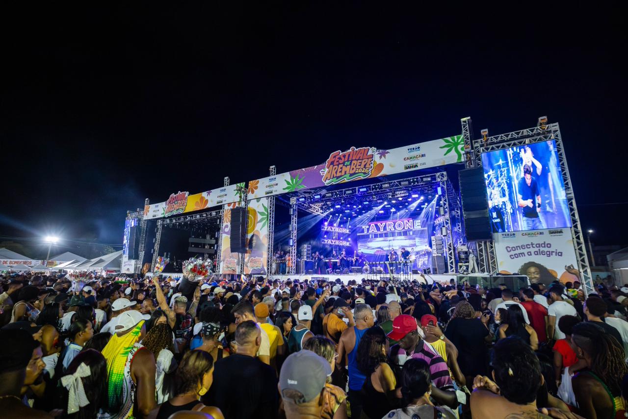 A noite deste domingo (15) marcou o encerramento das apresentações no Palco Katita do Festival de Arembepe 2026. Desde sexta-feira (13), o local reuniu milhares de pessoas que vivenciaram cada apresentação com intensidade e entusiasmo. Dados da Polícia Militar (PM-BA), apontam que mais de 150 mil pessoas curtiram o festival nos três dias de festejos - estimativa que contempla também os públicos dos blocos de rua e do palco Raízes e Ritmos, instalado na Praça Tia Deja.